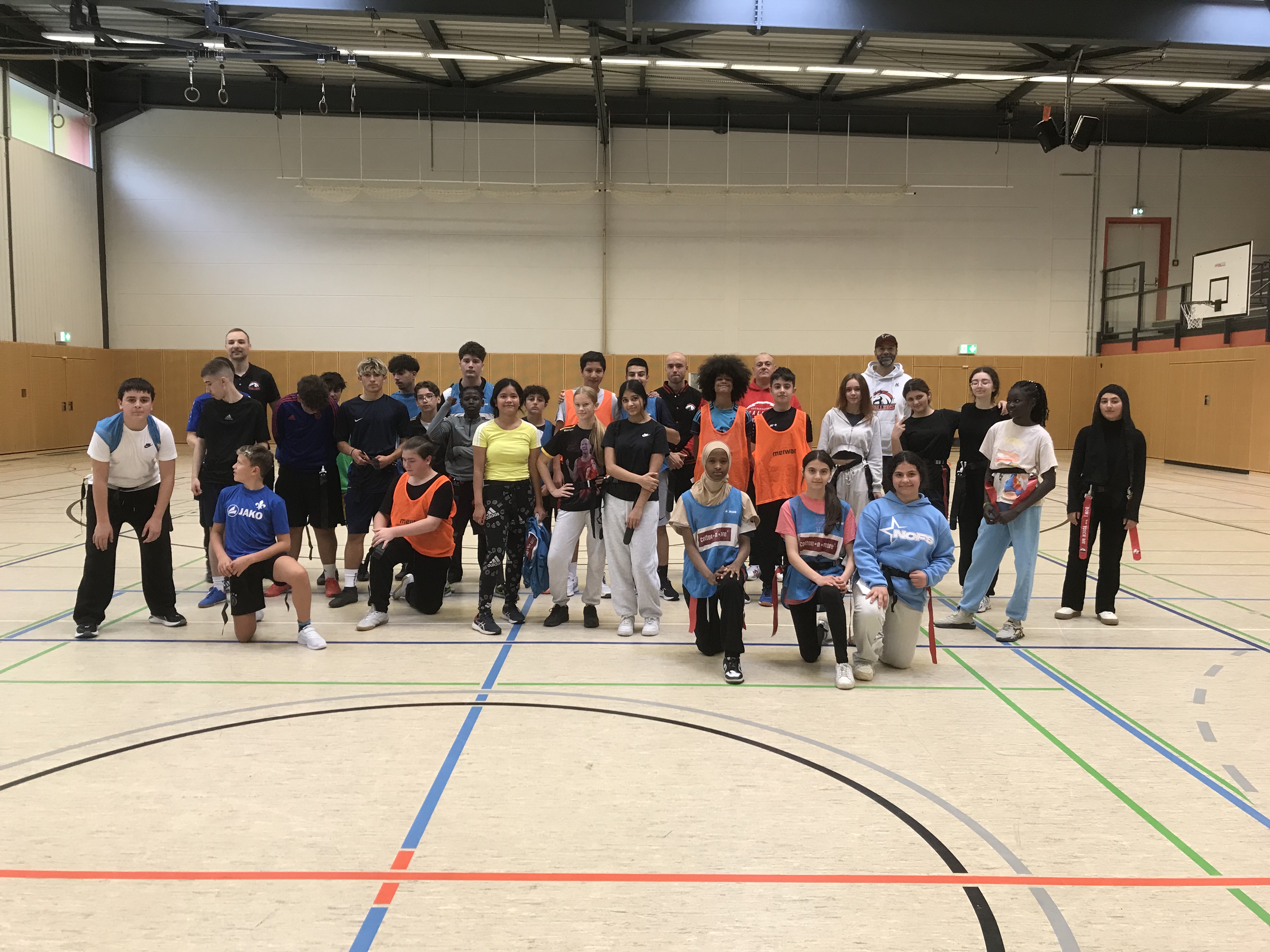 Heute war ein ganz besonderer Sporttag für die Mädels und Jungs aus den 8. Klassen. Die Aschaffenburger Stallions – Football – haben mit uns zusammen eine Trainingseinheit absolviert. Nach einigen typischen Aufwärmübungen haben wir in vier unterschiedlichen Gruppen unterschiedliche Übungen erledigt. Fangen, passen, abwehren. Alles was das Footballspiel ausmacht.